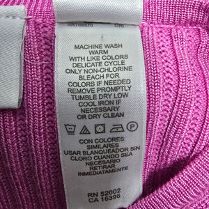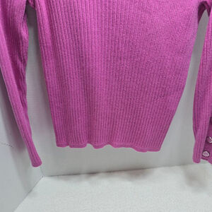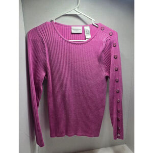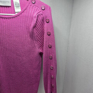 This is a pre-owned Liz Claiborne Petite long-sleeve, ribbed crew neck sweater in a vibrant pink hue. The sweater features decorative, non-functional buttons along the left shoulder and down the left sleeve. The fabric content, visible on the tag, is 48% rayon, 40% cotton, and 12% nylon. The care instructions indicate machine wash warm and tumble dry low. The sweater appears to be in good condition with no obvious signs of wear or imperfections.