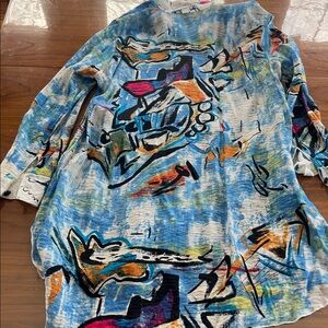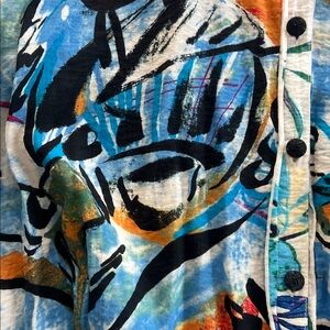 Vibrant abstract design. Button-down style. Long sleeves. Perfect for a bold look.