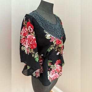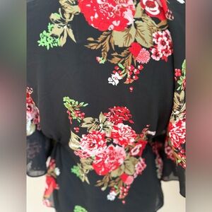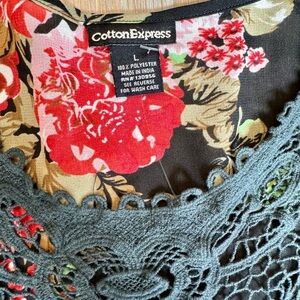 Cotton Express women’s sheer batwing black floral blouse size Large polyester
