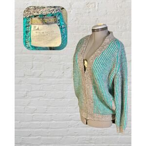 Vintage Mid 80s Esprit Sport Gray Teal Striped Half Zip Cardigan Sweater M