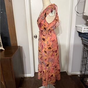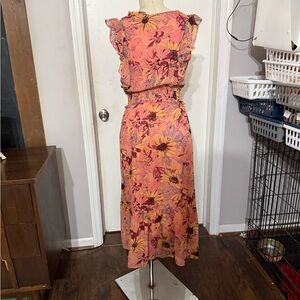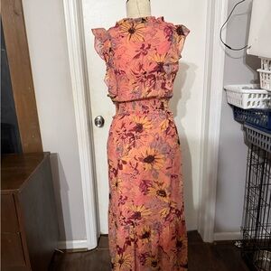 Chic jumpsuit with floral design. Features pink and gray hues. Perfect for any occasion.