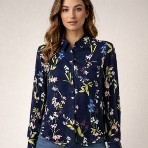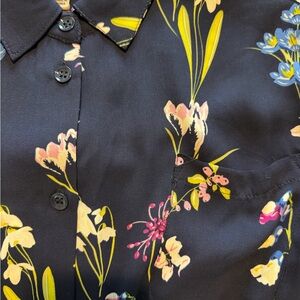 This navy semi shear button up blouse is great for casual or business wear.