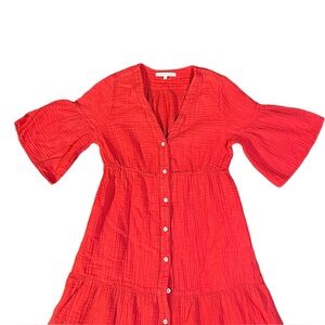 Chic red midi dress with button-down front. Features tiered design and short sleeves. Ideal for versatile styling.