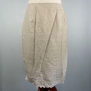Beautiful linen top and matching skirt featuring a small floral stitch design. The top measures 20 inches armpit to armpit laying flat in 21 inches in length from the shoulder to the hem. The skirt measures 16 inches at the waist and it’s 24 inches in length.