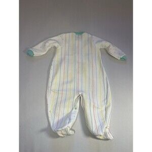Vintage Carters quilted baby sleeper/one-piece in a soft white waffle-textured fabric with pastel stripes and polka dots. Features teal snap buttons down the front and leg for easy changes, long sleeves, and enclosed feet. Adorable animal-in-a-basket graphic on the leg. Made of 100% polyester. Classic older Carters tag present; size tag is faded, so please refer to measurements for best fit. Likely fits infant 612 months based on length. Pre-owned vintage condition with light discoloration/age-related wear consistent with age; no holes noted. See photos for details.