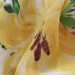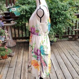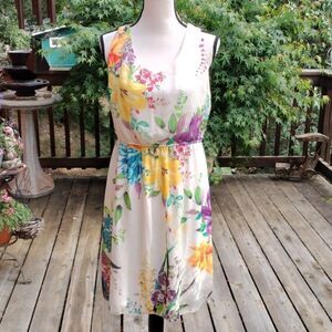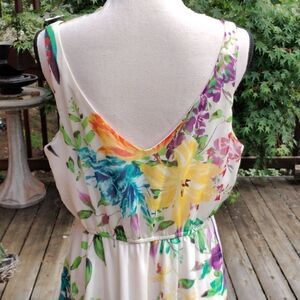 Such a pretty dress for lovely weather. Bright floral crinkly semi-sheer fabric on a creamy background. Elastic at waist. V neck front and back. Size L measures 44 at chest, 30-42 at waist, 48 at hips. 39 long from shoulder to hem. Easy and comfortable for a summer day.