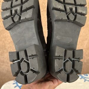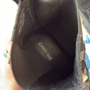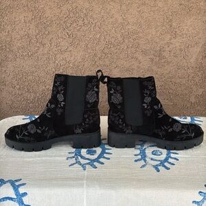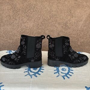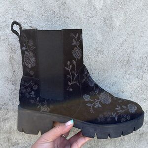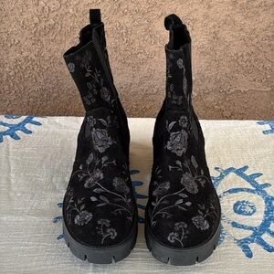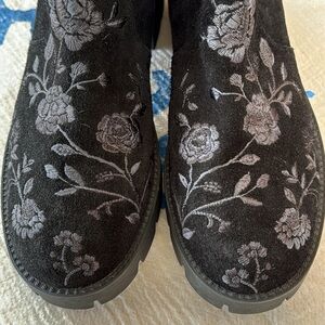 Johnny Was black suede with shiny embroidered flowers Vixie Chelsea Lug Sole.
