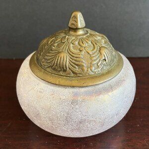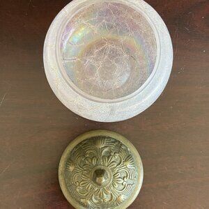 Vintage Iridescent Pink Glass Jar with Ornate Brass Cover.
