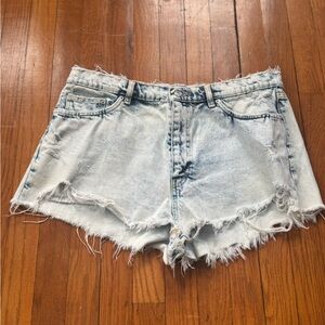 Super cute Zara light-wash distressed denim shorts with a raw frayed hem and vintage-style fading. High-rise fit with lots of stretch and a flattering cut. Perfect for summer, vacations, festivals, or casual everyday looks.