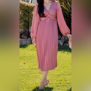 The Noelle Twist Front Pleated Midi Dress in a medium blush color and satin-like material feel. Features the following: