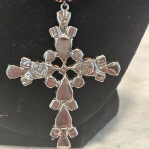 Dazzling necklace with pink and purple crystals. Features a stunning cross pendant. Ideal for adding sparkle to any outfit.