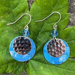 Blue Silver Hammered Circle Drop Earrings