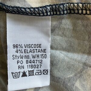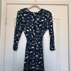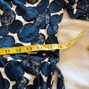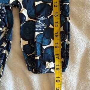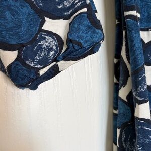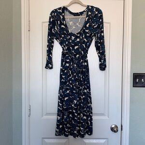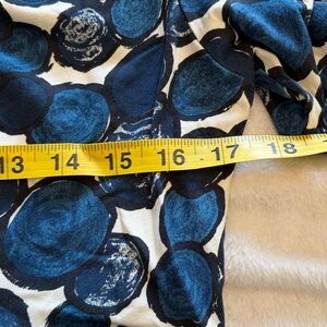 Boden three quarter sleeve dress with navy, cream and black circular pattern. Soft jersey knit fabric. Ideal for versatile styling. Scoop neck, matching knit belt. This didn’t hit at my waist…more under the bust. This is a 16L but it is euro sizing and would work well for a 12/14. Measures about 46 in from shoulder to bottom.