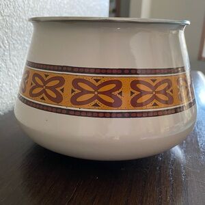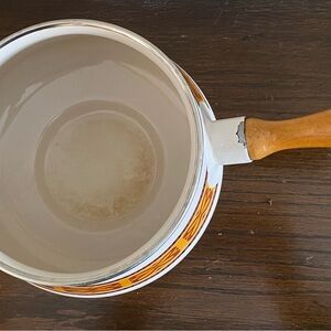 This vintage enamel saucepan features a charming retro design with a wooden handle, perfect for adding a touch of nostalgia to your kitchen. The white and orange colors create a warm and inviting look.