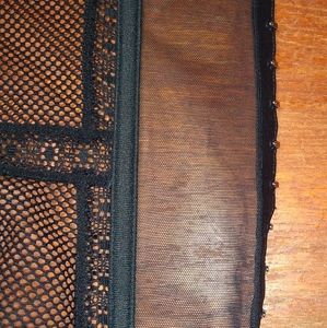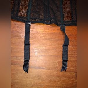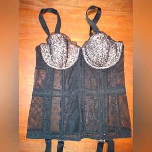 A sexy black merry widow lingerie corset. Cups are lined, pink material set behind lace on the front. Has built-in garters for stockings. Underwire and lengths of boning (most likely plastic). No brand or size tags. Very pretty.