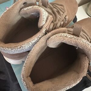 Stylish Skechers sneakers in a warm brown tone. Water repellent design for versatile wear. Warm soft interior. Worn for a few minutes in the house and discovered they were too small.