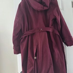 Burgundy trench coat perfect for any occasion. Features a classic double-breasted design with stylish button details. Comes with belt and hood that are removable. Has lining and hits a little below the knee.