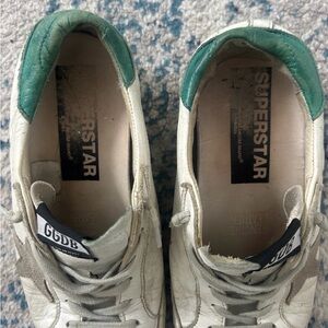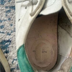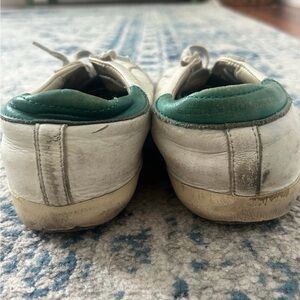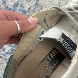 Golden Goose sneakers with a cream base and gray star detail. Casual and trendy design.