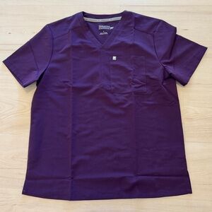 Stylish deep purple scrub set. Includes top and jogger pants. Perfect for healthcare settings.