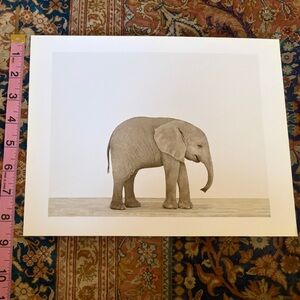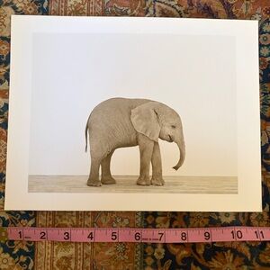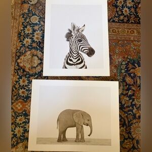 Two original prints by Sharon Montrose for The Animal Print Studio. 8.5 x 11. Elephant and zebra. Photographers initials on the back “SM”. These prints are no longer sold and available by the artist. Simply beautiful in their simplicity and clarity. Printed on heavyweight paper. A tiny bit of yellowing on the very edges but in a frame it won’t be noticeable. Used to be sold at Restoration Hardware. Collectibles. Mats and frames not included. Would be so perfect in a playroom, nursery, kids room. Anywhere. Minimalist. Black and white. Classic. Baby. Ethical. Art. Photography.