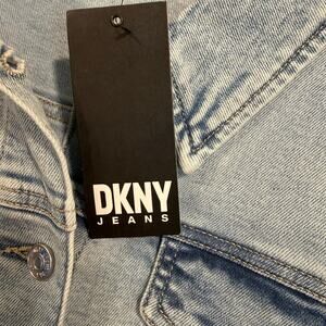 New with original tags. DKNY Jeans women’s cropped light wash denim Trucker jacket featuring a classic button-front design with chest flap pockets and side pockets. Comfortable stretch denim with a structured fit. Size up for oversized look