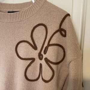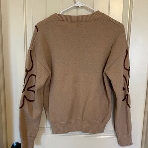 Embrace warmth with this tan sweater adorned with a cutesy floral design. Perfect for adding a touch of charm to your casual wardrobe.