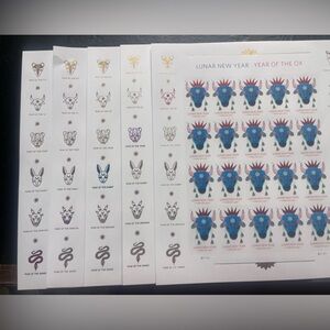 Celebrate the Lunar New Year with these vibrant Year of the Ox stamps. Features colorful ox designs.