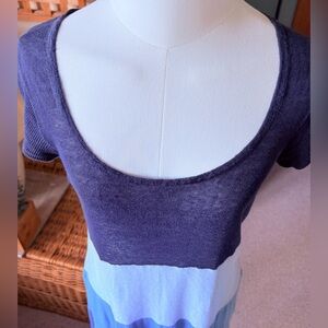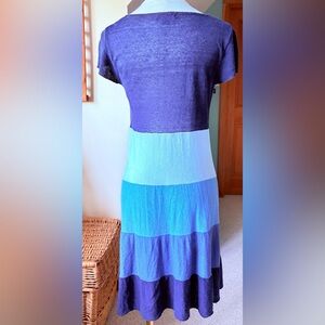 Boden stylish color-block stretchy linen dress with short sleeves, a scoop neck and an a-line swing in shades of blue and white. The photos in darker blue are truer to actual color. Light weight and breathable, loose fitting and comfortable.