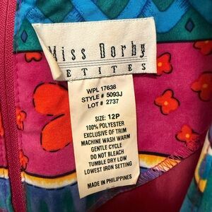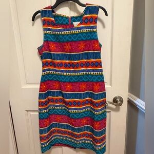 Brighten your wardrobe with this vibrant midi dress featuring a colorful floral pattern. Perfect for any occasion. Lined. Darts and back zipper closure. Fits just below the knee.