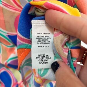 Vibrant floral design. Short sleeves. Ideal for casual wear or fun pop of color under a blazer. The brand is First Love by Lovelyn. Purchased at The Blue Door Boutique.