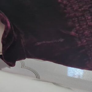 Gorgeous deep purple wine/merlot velvet bolero jacket with ruffled edges and dramatic collar. Size medium. Vintage Y2K Forever 21. In great condition other than a small tear which I have secured from fraying by hand stitching. It is directly underneath the armpit area and cannot be seen when wearing. Please see close-up in last picture. Comes from a smoke free home. Measurements are in pictures.