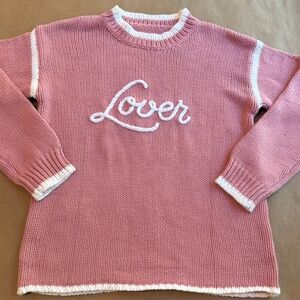 Hand-embroidered Pink “Lover” sweater, in Rose Pink with white trim and, size L