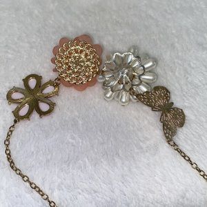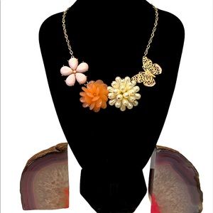 Candies Brand: Floral/Butterfly Statement Necklace NWOT. BEAUTIFUL NECKLACE FIRM. Necklace has a pink with white center butterfly, faux Pearl floral piece, peachy pink acrylic floral piece and light pink flower. Chain is gold plated. Well made. Length is 18 inches. Has 3 inches extender with lobster clasp.