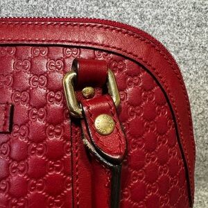 Elegant Gucci satchel crafted in rich burgundy microguccissima leather with structured top handles and an optional shoulder strap. A timeless silhouette with subtle logo embossing that elevates this piece without feeling loud.