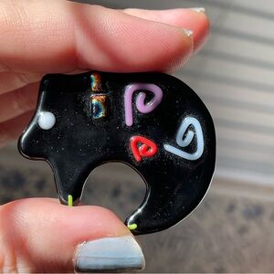 Vintage black art glass fetish bear style brooch Southwestern. Black bear in a fetish style, with colorful raised glass accents. Unmarked.