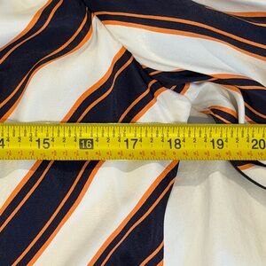 Elevate your style with this chic striped one-shoulder top. Featuring a blend of cream, navy, and orange hues, it's perfect for any occasion. Side hidden zipper, small snag as seen on last picture, hardly noticeable.