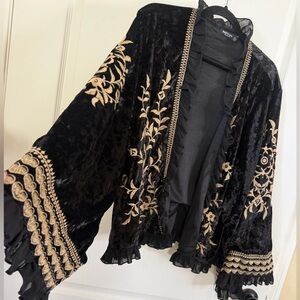 NWOT Nasty Gal Blk Velvet Gold Embroidered Open Front Boho Jacket. Size 4
