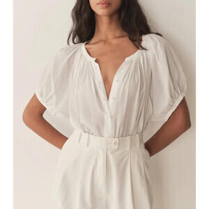 The DÔEN June Top is a stylish and relaxed button-up blouse featuring short puff sleeves and a scoop neckline. It is crafted from a cotton blend, making it comfortable and perfect for various occasions. The top has a loose fit with subtle ruching and is designed for a timeless, bohemian look, making it a great addition to your wardrobe.