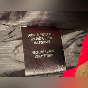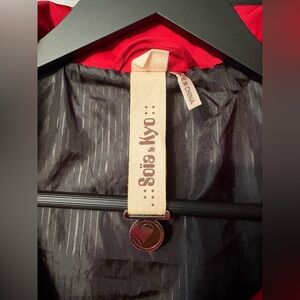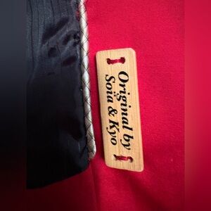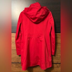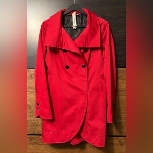 Stylish red trench coat with double-breasted design. Features button details and a sleek silhouette. Fits like a medium.