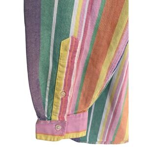 New with tags. Brighten your wardrobe with this vibrant Polo Ralph Lauren button-down shirt. This Classic Fit shirt showcases a lively rainbow stripe pattern, featuring a meticulously embroidered Polo player logo on the chest pocket, adding a signature touch of timeless style. The crisp fabric and button-down collar create a polished look perfect for casual outings or a relaxed office environment.