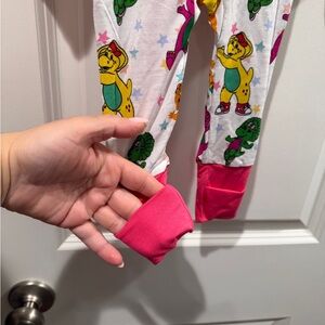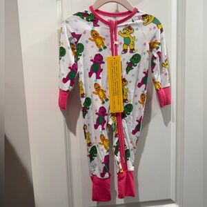 Adorable kids bamboo one piece pajama featuring vibrant Barney characters. Made for comfort and style, this pajama is perfect for bedtime fun. The playful design includes shades of pink and white, making it a delightful choice for your little one. This has a two-way zipper for easy diaper changes, fold over hands and fold over feet for extended wear. This is a size 0 to 3 months and it is new with tags.