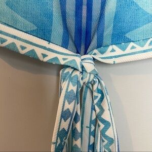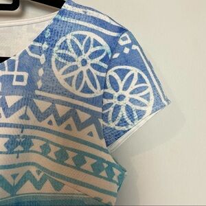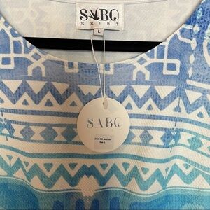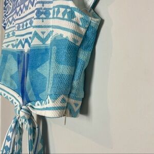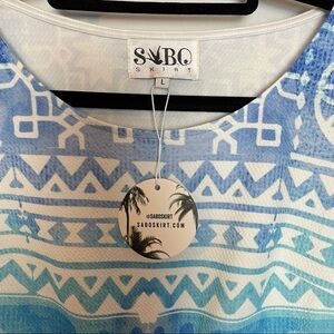 SABO NWT Cropped top with wrap around waist tie to tie in front and cap sleeves. Perfect spring/ summer/ vacation ware! Hidden side zipper. Well made and New With Tags and On Trend! The last picture I added is simply added so you can get an idea of how the tie can double wrap around the waist if desired. Size Large measurements are pit to pit 19 1/2โ length 14 1/2โ sleeve 4 1/2โ perfect summer addition to your wardrobe. (ND)
