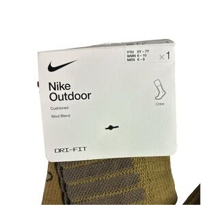 Nike Outdoor Cushioned Crew Socks made with a wool blend and Dri-FIT technology. They are designed for outdoor activities, offering moisture-wicking properties, anatomical cushioning, and arch support for comfort and durability.