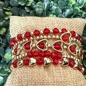 Charming bracelet set featuring red and gold beads. Perfect for adding a pop of color to your favorite outfit or to give as a gift.