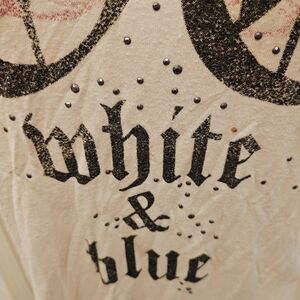 Y2K Rock & Republic Studded Rock White & Blue Graphic Tee w Strappy Neck Detail.