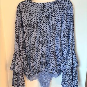 Blue, floral patterned V-neck bodysuit, w/ bell sleeves. Perfect with flares and boots x