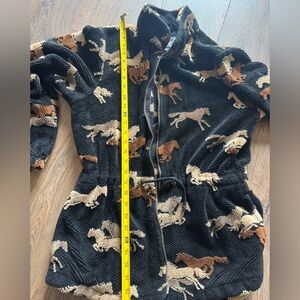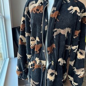 Cozy fleece jacket with a horse pattern. Features a zip-up front and high collar. Perfect for casual wear. Great VTG look