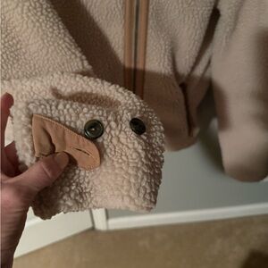 Soft oatmeal fleece jacket with a cozy feel. Fully lined. Ideal for cool weather. Contrasting light brown nylon trim.