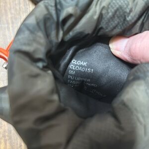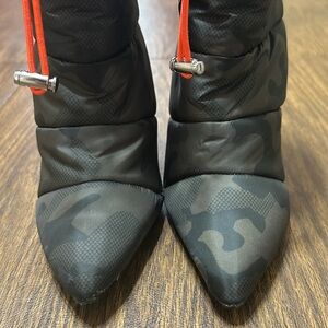 Sleek black camouflage boots with a pointed toe. Features a stylish orange accent. Perfect for a bold look.