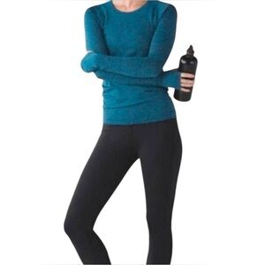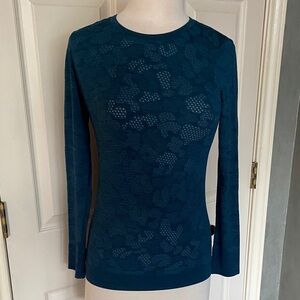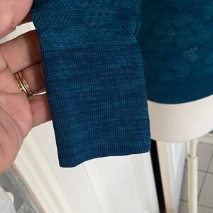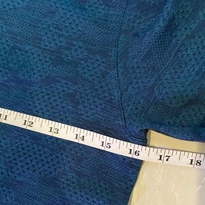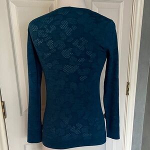 A gorgeous color combo blue/teal camouflage with vents for breathing. Seamless new style. One bar on inside hem New, unworn condition but tags have all been removed. Check measurements- guessing size 0-4 Ladies. Cool Turquoise and blue heathered camo top. Stylish blue jersey. Breathable fabric. Perfect for active wear. Similar to first 2 photos.